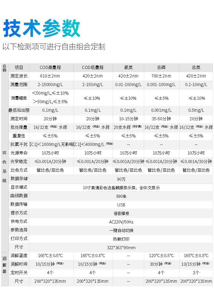 人工智能語(yǔ)音播報(bào)提示,可隨意調(diào)節(jié)音量, 使用更方便更 配備112種預(yù)先編程的曲線,曲線數(shù)量990條,可濃度直讀,測(cè)量結(jié)果更精密; 具有數(shù)據(jù)存儲(chǔ)功能,可存儲(chǔ)90萬(wàn)組數(shù)據(jù),并能自由查看; 10寸彩色液晶顯示觸摸屏,全中文操作模式,更便于操作掌握; 儀器自備校準(zhǔn)功能,可根據(jù)標(biāo)準(zhǔn)樣品計(jì)算, 并存儲(chǔ)曲線,無(wú)需手動(dòng)制作曲線; 配備USB接口傳輸功能,自帶打印機(jī),可打印當(dāng)前數(shù)據(jù)及存儲(chǔ)的歷史數(shù)據(jù); 采用管比色、皿比色,雙比色系統(tǒng)